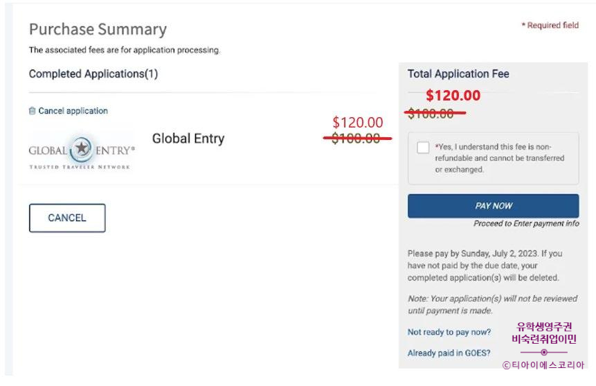 신청서 작성 후에는 $120의 비환불성 수수료를 결제해야 합니다. 결제는 신용카드나 전자 은행 송금으로 가능해요. 만 18세 미만의 미성년자는 부모나 법적 보호자가 Global Entry에 이미 가입했거나 신청 중인 경우 수수료가 면제될 수 있습니다.