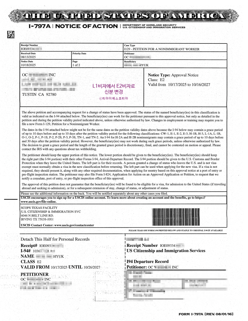 2025.10: I-129 승인, 동반 가족은 I-539 승인