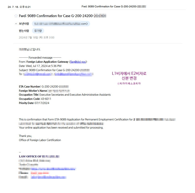 고객님은 E-2로 신분을 변경하기 전, 이미 **영주권 절차의 초기 단계인 노동허가서(PERM)**가 접수 중이었습니다. 변경 과정중에 노동허가서 승인을 받았습니다.