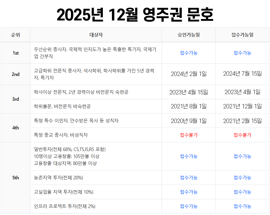현재 취업이민 중에는 1순위(글로벌 기업 간부, 세계적인 특기자)와 5순위(투자이민)만 비자발급과 접수가능 우선일자가 모두 오픈 상태를 유지 중이다.